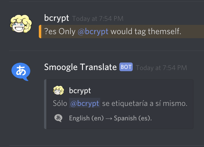 To translate right away without setting up auto translate, use `?` with a language code to translate to that language.