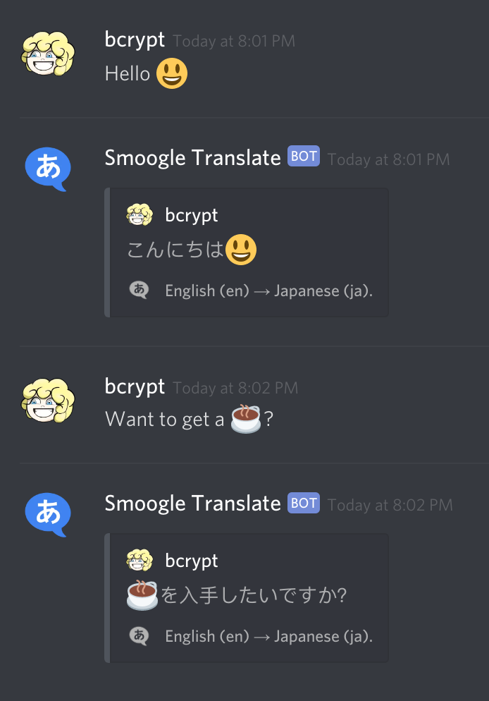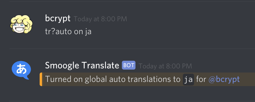 (Optional) Use the `!` prefix with a language code to tell it what the source language is. Without this option, the default is to auto detect the source language.
